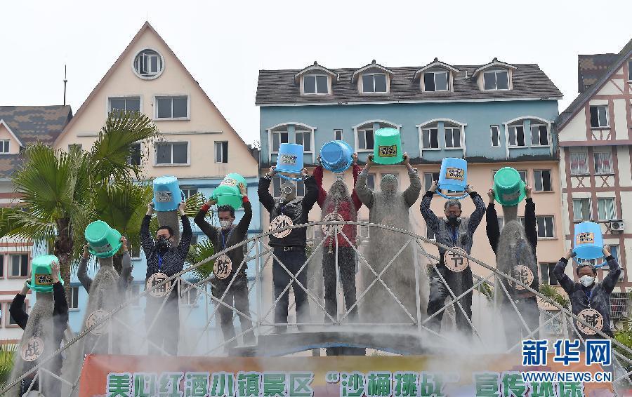 3月1日,在重庆市美心红酒小镇景区,沙桶挑战者将河沙从头顶倒下来,以宣传环境保护。当日,重庆市美心红酒小镇景区开展“沙桶挑战”宣传环保活动。20多名员工头戴防毒面具、耳塞、口罩等,将河沙从头顶倒下,用行为艺术向游客宣传防沙抗旱、节能减排等环保理念,呼吁大家共同保护环境。新华社记者 陈诚 摄图片来源:新华网