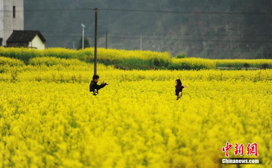 3月2日,三湘大地春暖花开,湖南资兴蓼江古镇盛开的万亩油菜花吸引了众多游客参观,游客行走在油菜花田间,仿佛置身于黄色“花海”中。 杨华峰 摄