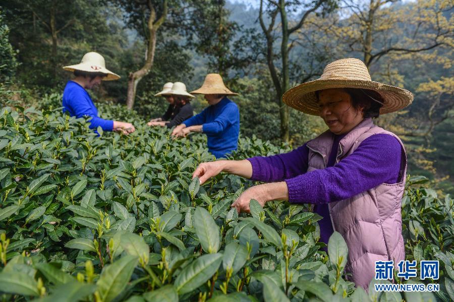 3月17日,60多岁的茶农赵雪芬(右一)在杭州梅家坞村的茶园内与同伴一起采摘今年首批西湖龙井。随着天气转暖,浙江杭州日最高气温突破20摄氏度,西湖龙井茶一级保护区里的龙井村、梅家坞村、龙坞村、翁家山村等核心产茶区的茶农们陆续开始采摘今年第一批西湖龙井茶。据茶农介绍,近两天只是少量采摘,由于气候、水分、阳光适宜,龙井茶树的芽头生长较快,预计再过一周就会进入明前茶的大批量采摘期,产量和价格预计与去年持平。新华社记者 徐昱 摄