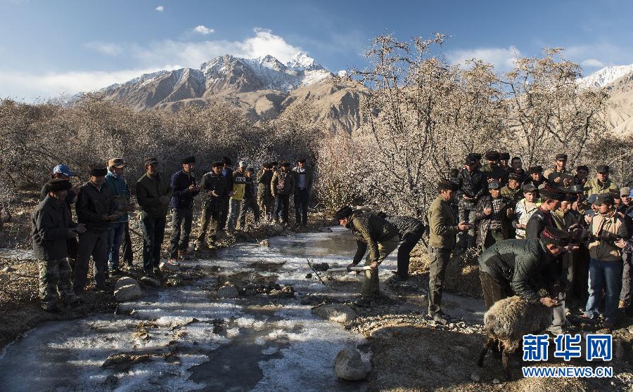 3月18日,在新疆塔什库尔干塔吉克族自治县提孜那甫村,妇女们在房顶上将象征吉祥的清水泼洒在客人身上。当日,帕米尔高原东南部的塔什库尔干塔吉克族自治县冰雪初消,位于雪山脚下的提孜拉甫乡提孜那甫村因“迎春”而热闹起来,塔吉克族群众在举行一年一度的“引水节和播种节”。新华社记者 江文耀 摄