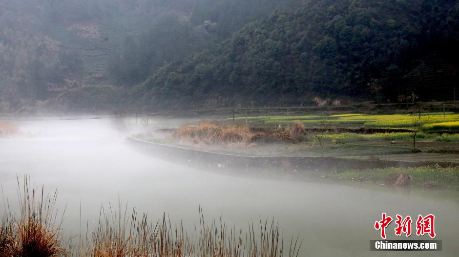 3月18日,安徽省黄山市新安江横江段阵雨过后,出现罕见的平流雾奇观,沿岸乡村田园雾气缠绕,若隐若现,宛如仙境。中新社发 施广德 摄 图片来源:CNSPHOTO