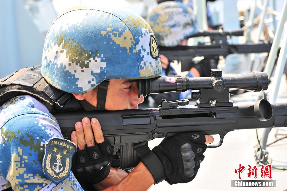 3月18日,中国海军第十九批护航编队组织特战队员进行轮换射击训练,每名特战队员轮换使用重机枪、重型狙击步枪和榴弹发射器等多型号枪械,对海上漂浮靶进行射击。以提高特战队员的一专多能水平,始终保持良好的战备状态,提高快速反应和危机情况处置能力。中新社发 熊利兵 摄