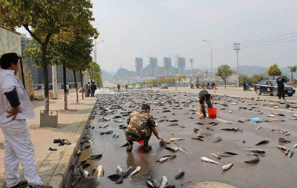 2015年3月17日12时许,一辆装载13600斤鲶鱼的大货车途经贵州黔东南州凯里市开发区时,因货箱门意外开启,导致车上的鲶鱼散落公路沿线,公路瞬间成“鱼池”。