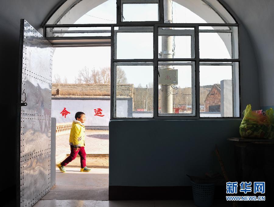 3月19日,一年级的学生段宏宇在校园内玩耍。在内蒙古自治区清水河县盆地青村,有一所只有8名学生、7名老师的“窑洞小学”。在这所山村小学里,有两孔窑洞是学生们的教室,偌大的校园显得空旷。上世纪九十年代,盆地青村一度拥有中学建制。近年来,当地农村生源流失迅速,以往的初中教室也已荒废,尚存的几孔窑洞在去年经过翻新,成为了现在的盆地青小学。由于生源严重缺乏,盆地青小学现仅有一、二、四、五共四个年级,7名老师不仅仅负责语文、数学、英语、音乐等学科的正常授课,还要负责几名孩子的饮食起居。在这所“窑洞小学”里,一年级与五年级共有3名学生,在一间教室上课,余下的二年级与四年级的学生在一起上课,这种跨年级的上课模式在当地被称为“复班”。语文老师毛建英说:“往往给四年级的同学刚上完课,又要给二年级的学生再仔细讲一遍。也算是一对一教学了。”但是她表示:“虽然‘窑洞小学’条件有限,学生少,但是作为老师,我们就应该履行职责,否则这些孩子就将面临失学。” 新华社发(连振 摄)
