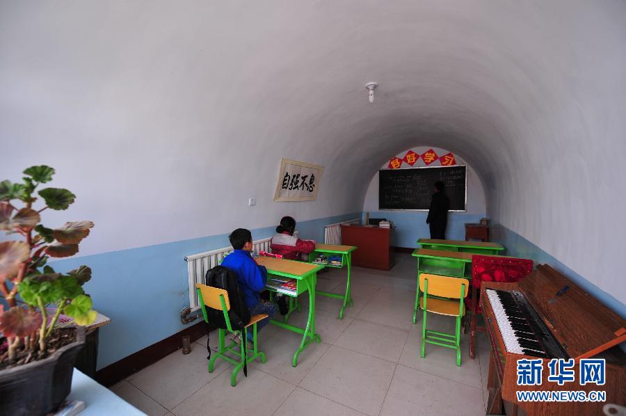 3月19日,盆地青小学的学生们在窑洞内上课。在内蒙古自治区清水河县盆地青村,有一所只有8名学生、7名老师的“窑洞小学”。在这所山村小学里,有两孔窑洞是学生们的教室,偌大的校园显得空旷。上世纪九十年代,盆地青村一度拥有中学建制。近年来,当地农村生源流失迅速,以往的初中教室也已荒废,尚存的几孔窑洞在去年经过翻新,成为了现在的盆地青小学。由于生源严重缺乏,盆地青小学现仅有一、二、四、五共四个年级,7名老师不仅仅负责语文、数学、英语、音乐等学科的正常授课,还要负责几名孩子的饮食起居。在这所“窑洞小学”里,一年级与五年级共有3名学生,在一间教室上课,余下的二年级与四年级的学生在一起上课,这种跨年级的上课模式在当地被称为“复班”。语文老师毛建英说:“往往给四年级的同学刚上完课,又要给二年级的学生再仔细讲一遍。也算是一对一教学了。”但是她表示:“虽然‘窑洞小学’条件有限,学生少,但是作为老师,我们就应该履行职责,否则这些孩子就将面临失学。” 新华社发(连振 摄)