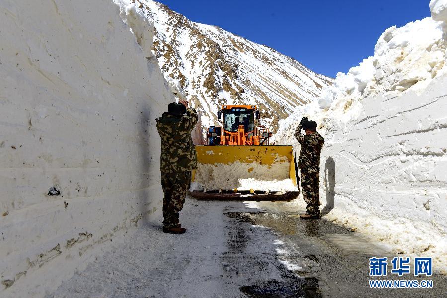 3月20日,武警官兵在厚达3米的积雪路段上进行铲雪作业。近日,西藏阿里地区普兰县持续降下大到暴雪,导致该县部分道路中断。武警交通四支队某部派出大型机械,全力抢通积雪路段,使雪封路段逐步恢复通行。新华社发(葛庆敏 摄)