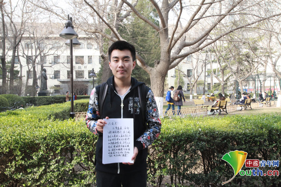 北师大物理系本科生武晓忠接受采访时说:“从多渠道、全面了解相关事件,在了解事实的基础上通过自己的分析研究得出对于事件的判断和意见,不可以人云亦云。要拥有全面的眼光、深刻的视角以及相对客观的立场。不做‘五毛’也不做‘愤青’。” 中国青年网记者 王秀丽摄