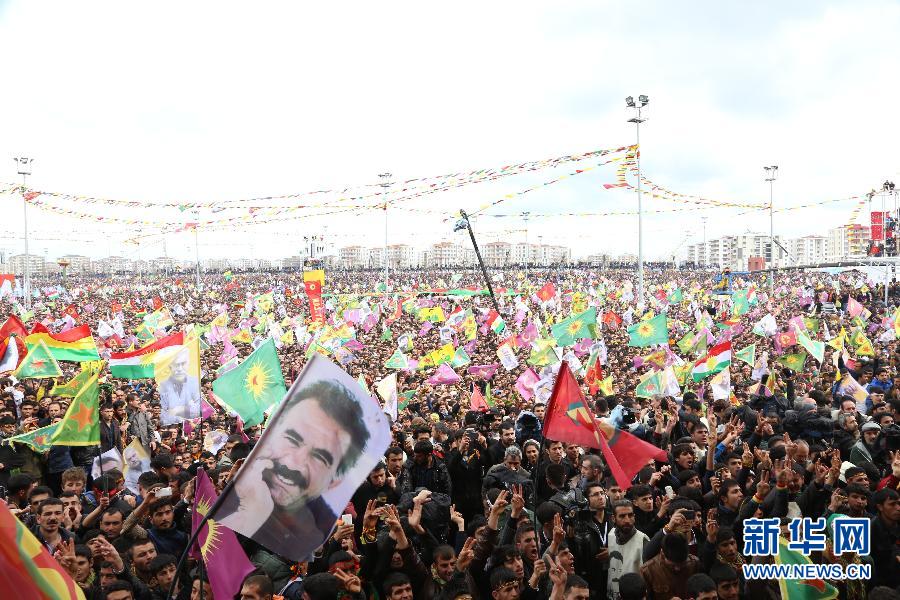 3月21日,在库尔德人聚居的土耳其东南部迪亚巴克尔省举行的大规模“诺鲁孜”节庆祝活动上,民众挥舞着土耳其库尔德工人党领导人厄贾兰的肖像。当日,被政府囚禁的土耳其库尔德工人党领导人厄贾兰再次呼吁其武装人员召开会议,民主解决库尔德问题,以结束武装斗争。 新华社记者邹乐摄