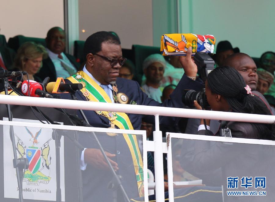3月21日,在纳米比亚首都温得和克独立体育场,纳米比亚新总统哈格·根哥布举起总统旗。当日,纳米比亚新总统哈格·根哥布在首都温得和克宣誓就职。 新华社记者吴长伟摄