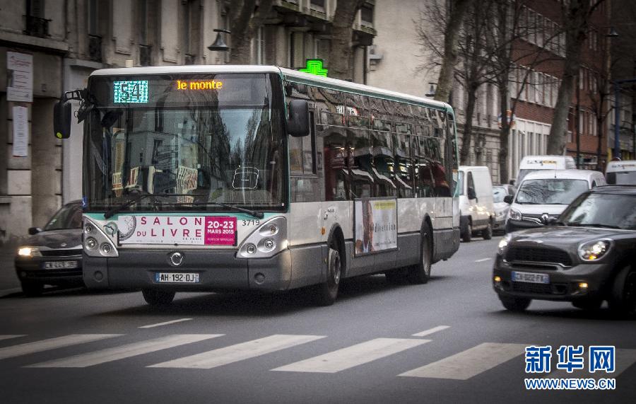 3月21日,一辆公交车行驶在巴黎市区的街道上。由于法国首都巴黎以及北部部分城市连日来的雾霾迟迟不散,巴黎将于23日当天实施紧急交通限行措施。届时,除出租车、电动车和救护车外,只有车牌尾号为单数的机动车可以上路。另外,巴黎及其周边城镇的公共交通设施将向居民免费开放到23日。新华社记者陈晓伟摄