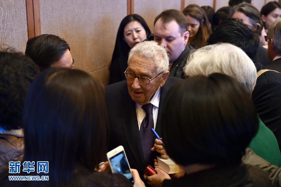 3月21日,会议结束后,美国前国务卿基辛格(中)接受媒体记者采访。当日,美国前国务卿亨利·基辛格在出席“中国发展高层论坛2015”经济峰会时说,中美构建新型大国关系既有机遇,也有挑战,两国应充分认识合作的必要性和重要性。新华社记者 李鑫 摄