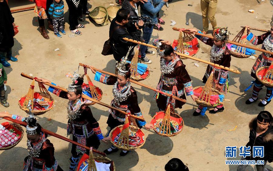3月21日,在广西三江侗族自治县梅林乡梅林村,侗族群众挑着侗族特色饰品去参加侗族大歌节。当日是农历二十四节气中的“春分”,广西柳州市三江侗族自治县梅林乡举行“二月二”侗族大歌节,当地侗族、苗族、壮族群众欢聚一堂,放声高歌。新华社发(谭凯兴 摄)