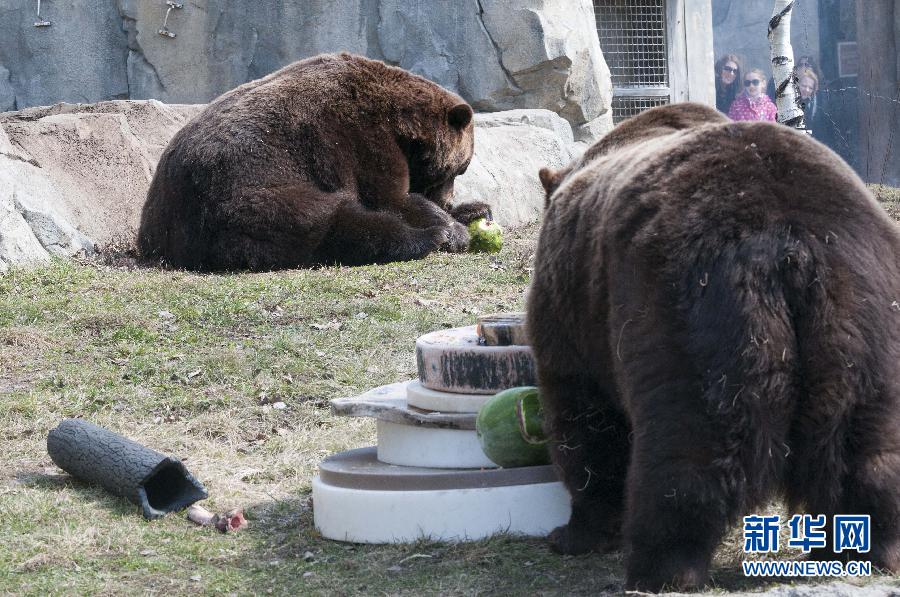 3月21日,在美国芝加哥布鲁克菲尔德动物园,一对灰熊兄弟在生日派对上享受美食。当日,这对灰熊兄弟迎来他们的20岁生日。公园管理方介绍,这对灰熊兄弟1995年出生于阿拉斯加,同年成为孤儿后被送到布鲁克菲尔德动物园,从此他们一直生活在这里。新华社记者何险峰摄