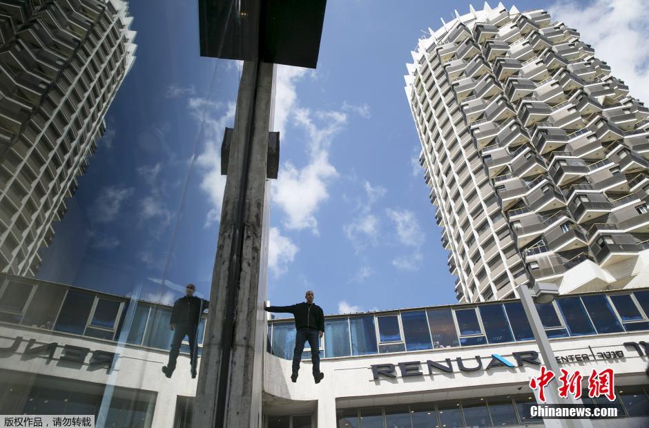 当地时间2015年3月22日,以色列特拉维夫市,以色列魔术师Hezi Dean表演所谓的悬浮技巧。据了解,Dean将24小时悬浮在特拉维夫的大楼外。