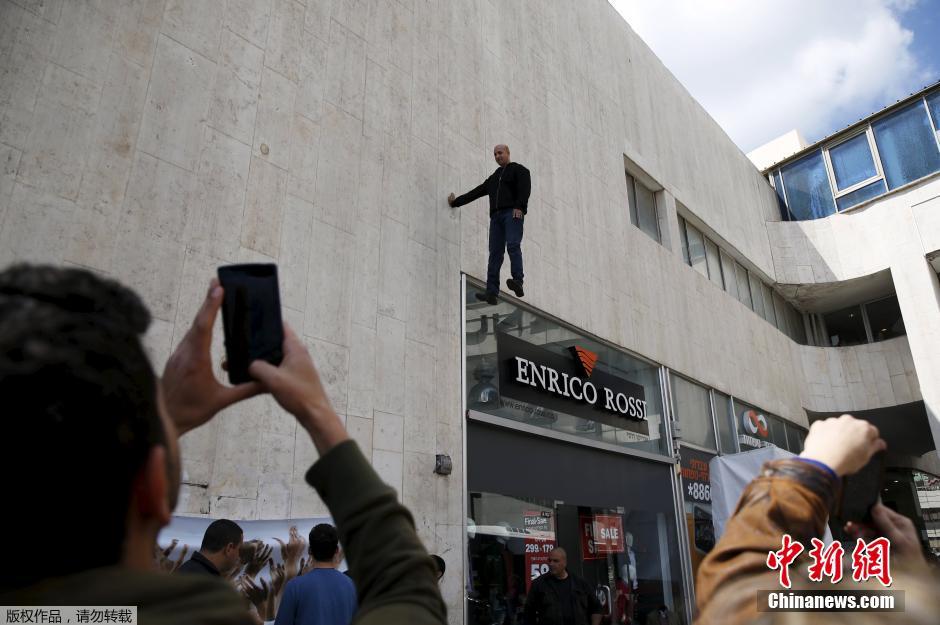 当地时间2015年3月22日,以色列特拉维夫市,以色列魔术师Hezi Dean表演所谓的悬浮技巧。据了解,Dean将24小时悬浮在特拉维夫的大楼外。