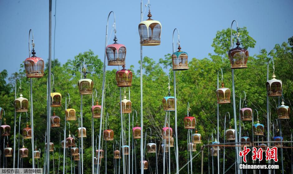 这是3月22日在泰国那拉提瓦府拍摄的参加鸟儿歌咏大赛的鸟。来自泰国、马来西亚、新加坡和印度尼西亚的数百只鸟儿当日在泰国那拉提瓦府参加了一年一度的鸟儿歌咏大赛。