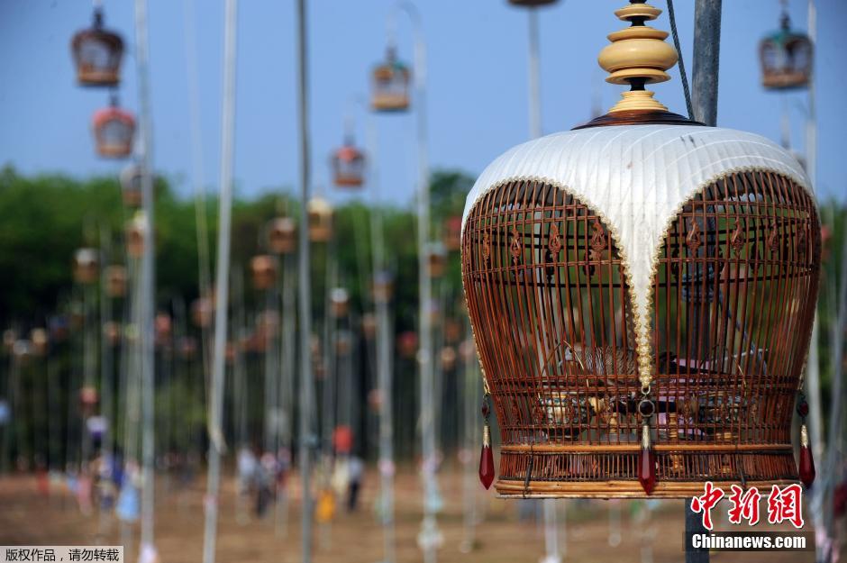 这是3月22日在泰国那拉提瓦府拍摄的参加鸟儿歌咏大赛的鸟。来自泰国、马来西亚、新加坡和印度尼西亚的数百只鸟儿当日在泰国那拉提瓦府参加了一年一度的鸟儿歌咏大赛。
