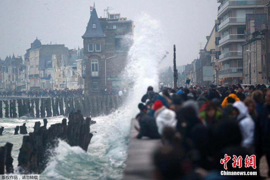 图为涨潮时,游客们在圣米歇尔山上围观潮汐拍打城堡墙壁。