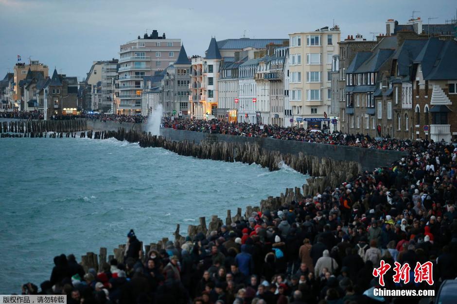 图为大量游客聚集在城墙和观景平台处,等候潮水到来,一睹“孤岛仙山”奇景出现。圣米歇尔山是联合国教科文组织世界遗产,是个近岸岩石小岛,主要靠一条堤道连接陆地。日前大潮却令水位急升,潮汐差距逾14米创新高,淹没堤道和小岛四周的流沙,令圣米歇尔山恍如一座“海中孤城”。