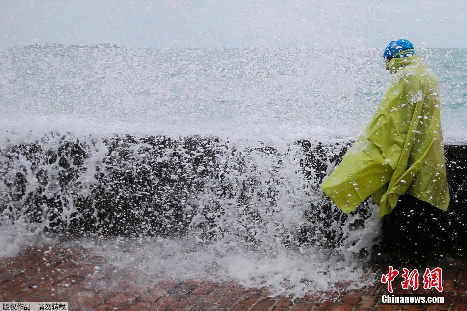 图为猛烈的海浪拍打在城墙上,扬起的水花溅到城墙边缘观潮的游客。