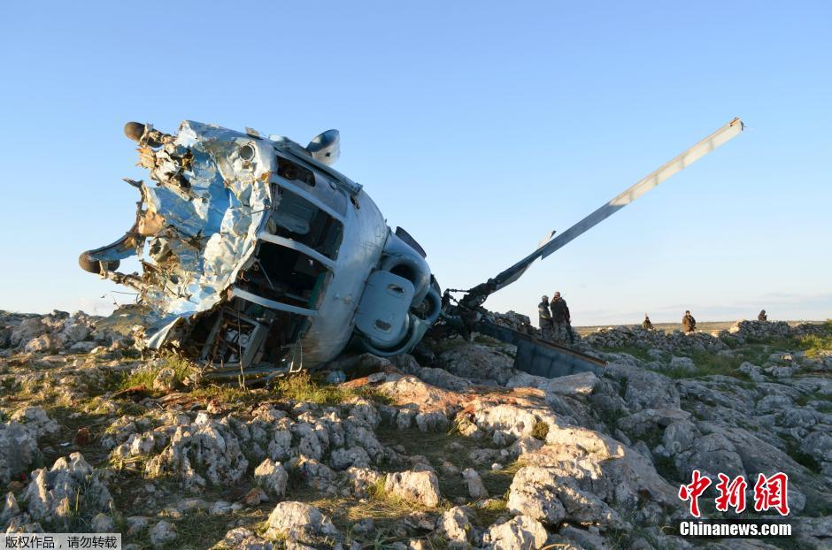 当地时间3月22日,叙利亚伊德利卜Jabal al-Zawiya,叙利亚人权观察组织报道称叙利亚政府军的一架直升机由于技术故障在当地坠毁,反政府武装抓获4名机组人员,另有一名士兵丧生。图为反对派武装人员在检查坠毁直升机残骸。
