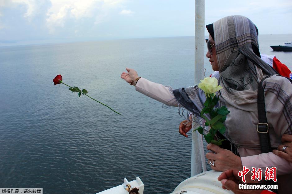 当地时间3月22日,印尼加里曼丹中部,亚航失事航班QZ8501遇难乘客和机组人员家属前往客机坠毁海域撒花,悼念遇难亲人。