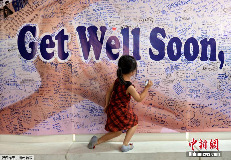 当地时间2015年3月22日,新加坡,民众写祝福语,在医院外放置礼物和鲜花,为正在住院的前总理李光耀祈福。