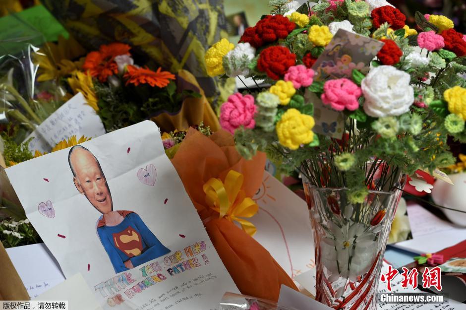 当地时间2015年3月22日,新加坡,民众写祝福语,在医院外放置礼物和鲜花,为正在住院的前总理李光耀祈福。