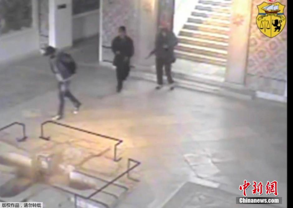 2015年3月22日消息,突尼斯内政部21日在其官方Facebook上发布的两名枪手袭击博物馆电视录像的视频截图。18日的袭击事件据称由极端组织“伊斯兰国”(IS)圣战组织发起,袭击事件中共有20名游客、1名警察和1名枪手身亡。