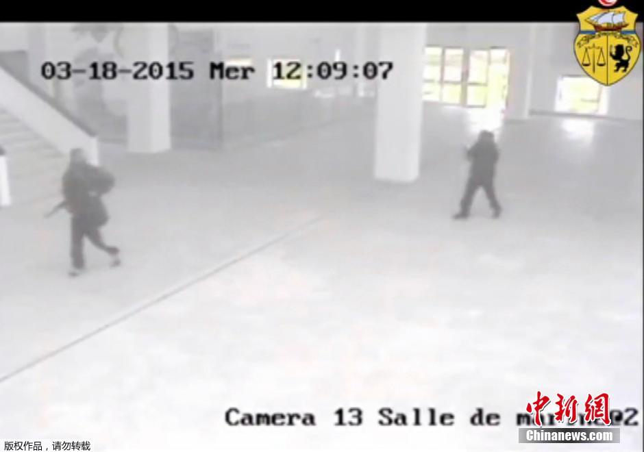 2015年3月22日消息,突尼斯内政部21日在其官方Facebook上发布的两名枪手袭击博物馆电视录像的视频截图。18日的袭击事件据称由极端组织“伊斯兰国”(IS)圣战组织发起,袭击事件中共有20名游客、1名警察和1名枪手身亡。