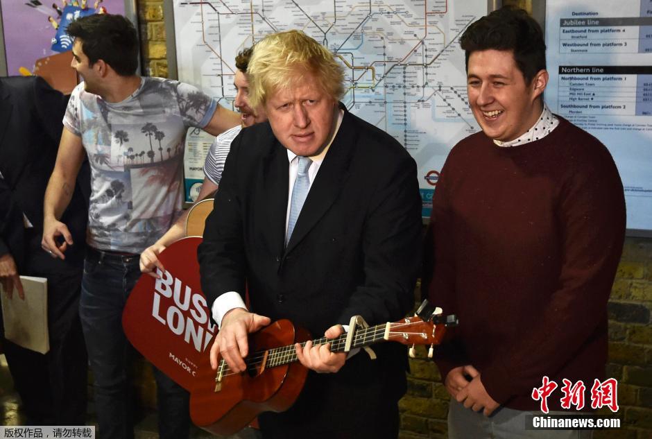 当地时间2015年3月23日,英国伦敦,伦敦市长鲍里斯-约翰逊与街头表演乐队The Tailormade在伦敦桥地铁站一起为政府提出的两个支持和推广街头表演的计划造势。