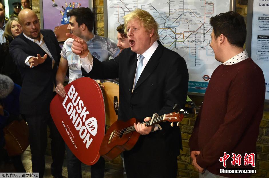 当地时间2015年3月23日,英国伦敦,伦敦市长鲍里斯-约翰逊与街头表演乐队The Tailormade在伦敦桥地铁站一起为政府提出的两个支持和推广街头表演的计划造势。