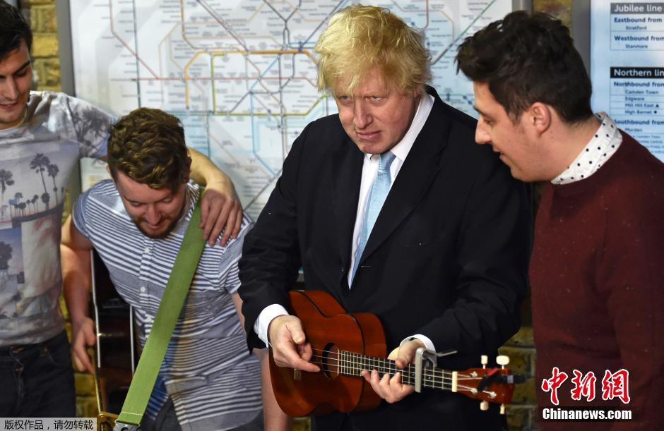 当地时间2015年3月23日,英国伦敦,伦敦市长鲍里斯-约翰逊与街头表演乐队The Tailormade在伦敦桥地铁站一起为政府提出的两个支持和推广街头表演的计划造势。