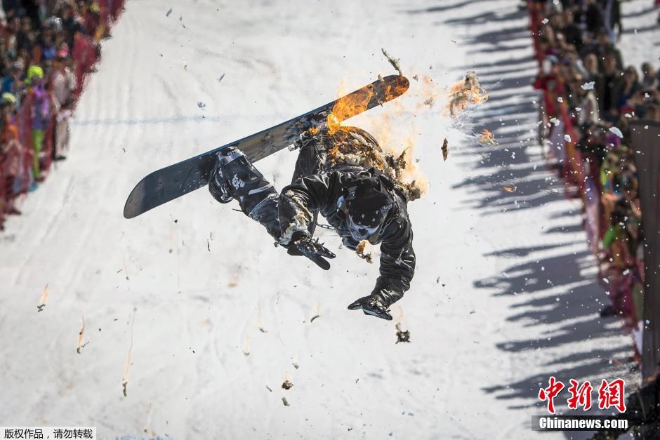 3月22日,哈萨克斯坦阿拉木图,滑雪运动者参加红牛冰冻水池跳跃比赛。参赛者身穿各式节日服装,以各种绝技跳起跃入冰水池中。