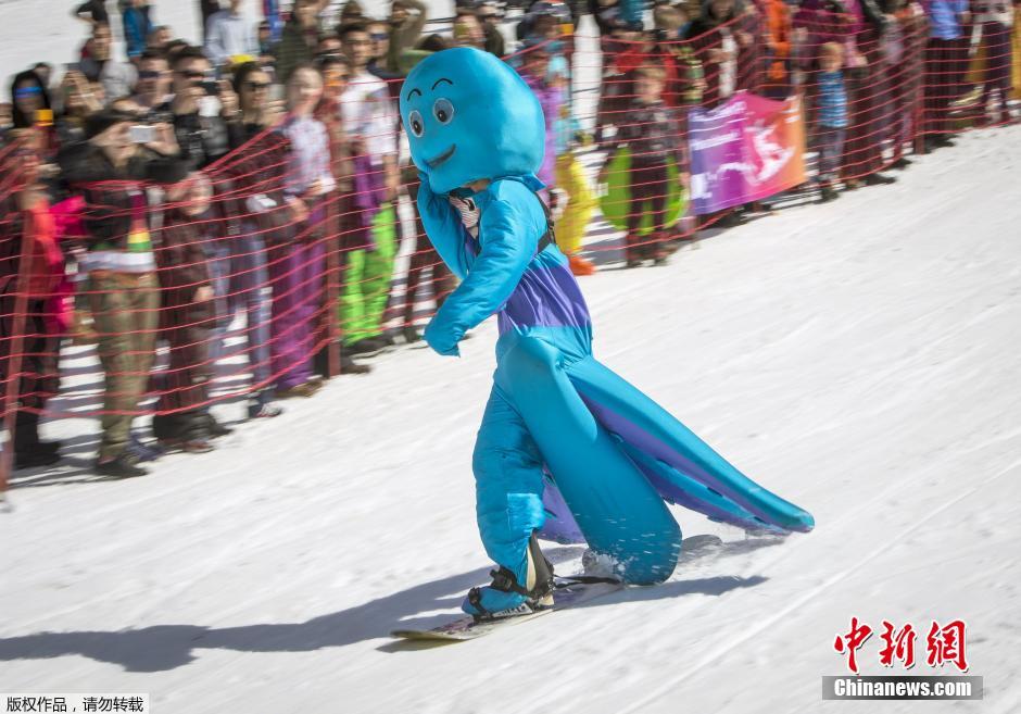 3月22日,哈萨克斯坦阿拉木图,滑雪运动者参加红牛冰冻水池跳跃比赛。参赛者身穿各式节日服装,以各种绝技跳起跃入冰水池中。
