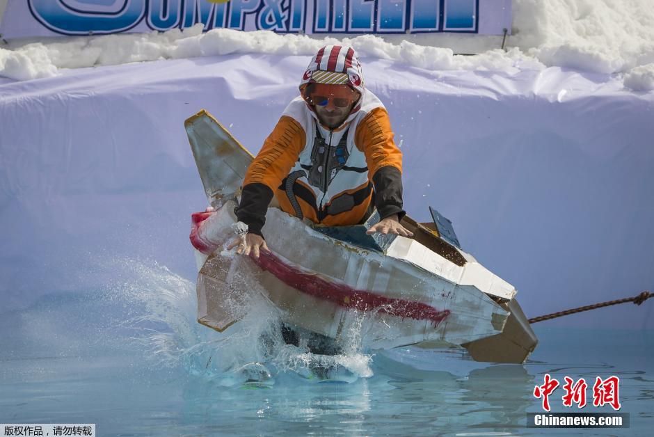 3月22日,哈萨克斯坦阿拉木图,滑雪运动者参加红牛冰冻水池跳跃比赛。参赛者身穿各式节日服装,以各种绝技跳起跃入冰水池中。