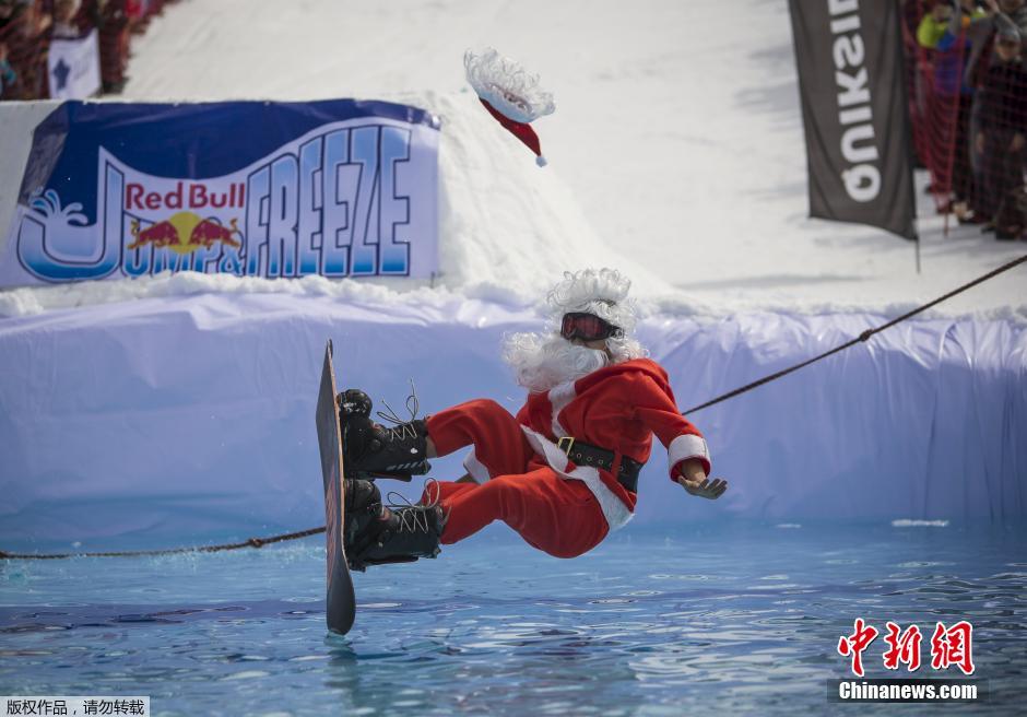 3月22日,哈萨克斯坦阿拉木图,滑雪运动者参加红牛冰冻水池跳跃比赛。参赛者身穿各式节日服装,以各种绝技跳起跃入冰水池中。
