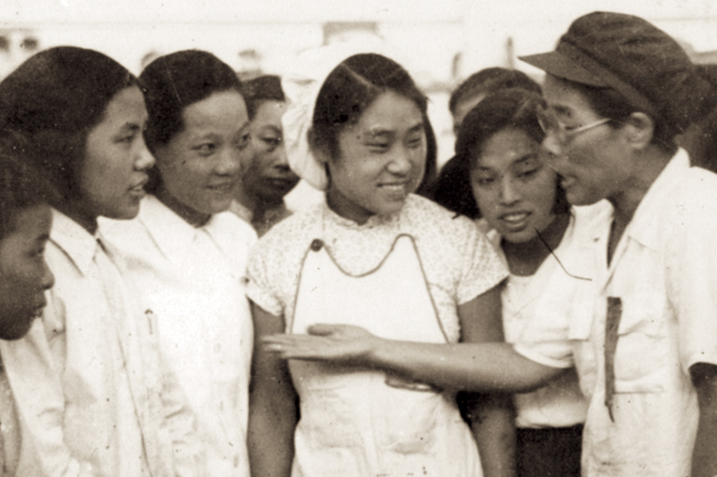 1951年中华全国总工会副主席、全国纺织总工会主席陈少敏向纺织女工宣传郝建秀工作法。(资料)