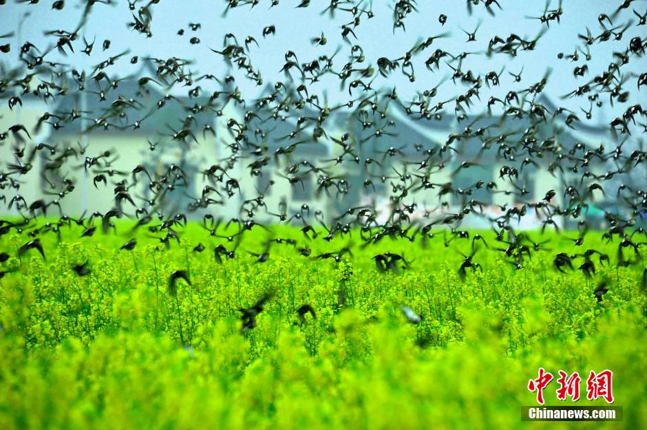 三月以来,湖南安仁县永乐江镇新丰村万亩油菜花海中,数以万计的小鸟在这里欢聚梄息,汇融出“鸟语花香”的独特生态奇观。中新社发 何超 摄