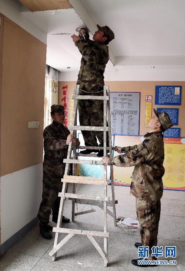 3月26日,战士们在维护修缮东海游击总队革命烈士纪念馆陈列室。