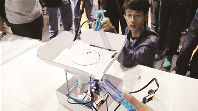 在比赛现场,记者发现五支队伍都有自己的队名和不同的创意。phoenix、sky、ash of time……“取这个队名就是希望年轻的我们,能够不虚度光阴,在进入社会之前的大学四年里能燃烧青春做一些有意义的事。”ash of time团队队长汪智鸿告诉记者,他们五个人都是大一的学生,分别来自于天津理工大学电信、自动化、仿真等多个专业,平时就经常在学校的实验室里做一些小创意,这次创客比赛更为他们提供了展示创意的广阔舞台。