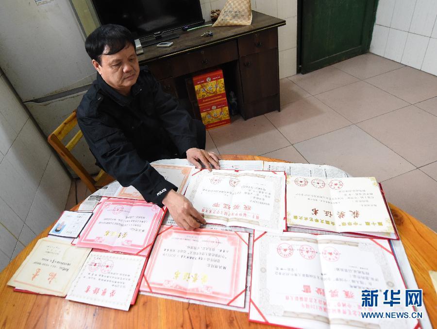 陆汉迎在家里整理诗歌创作获得的部分奖状和荣誉证书(3月27日摄)。 新华社记者 陆波岸 摄 图片来源:新华网