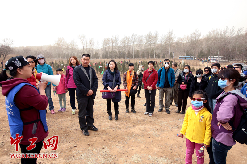 3月28日,北京德胜街道总工会组织三夫户外等九家企业近50名工会会员,来到北京怀柔举办以“撒播一片绿色让北京更美 爱护环境你我同行”为主题的植树活动。活动当日,北京正直扬沙天气,翠绿的树苗与满眼的黄沙形成鲜明对比,热火朝天的植树现场成为最靓丽的一道风景线。 中工网记者 李雪峰 摄