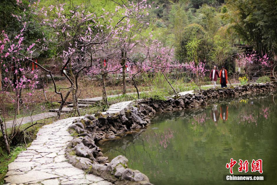 “忽如一夜春风来,千树万树桃花开”。近日,地处武陵山深处的国家5A级旅游景区——重庆酉阳桃花源境内,粉色桃花竞相吐蕊,于山野葱郁间,点点花瓣随轻风漫卷起舞,再现田园诗人陶渊明笔下“芳草鲜美,落英缤纷”的“桃源”胜景。3月30日,桃源美景引来游人如织,不少汉服爱好者驻足留影。 刘渝 摄