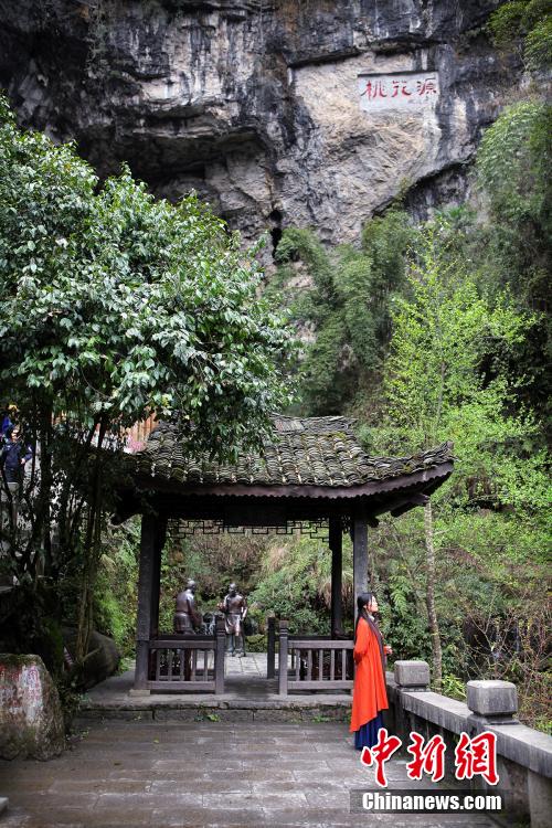 “忽如一夜春风来,千树万树桃花开”。近日,地处武陵山深处的国家5A级旅游景区——重庆酉阳桃花源境内,粉色桃花竞相吐蕊,于山野葱郁间,点点花瓣随轻风漫卷起舞,再现田园诗人陶渊明笔下“芳草鲜美,落英缤纷”的“桃源”胜景。3月30日,桃源美景引来游人如织,不少汉服爱好者驻足留影。 刘渝 摄