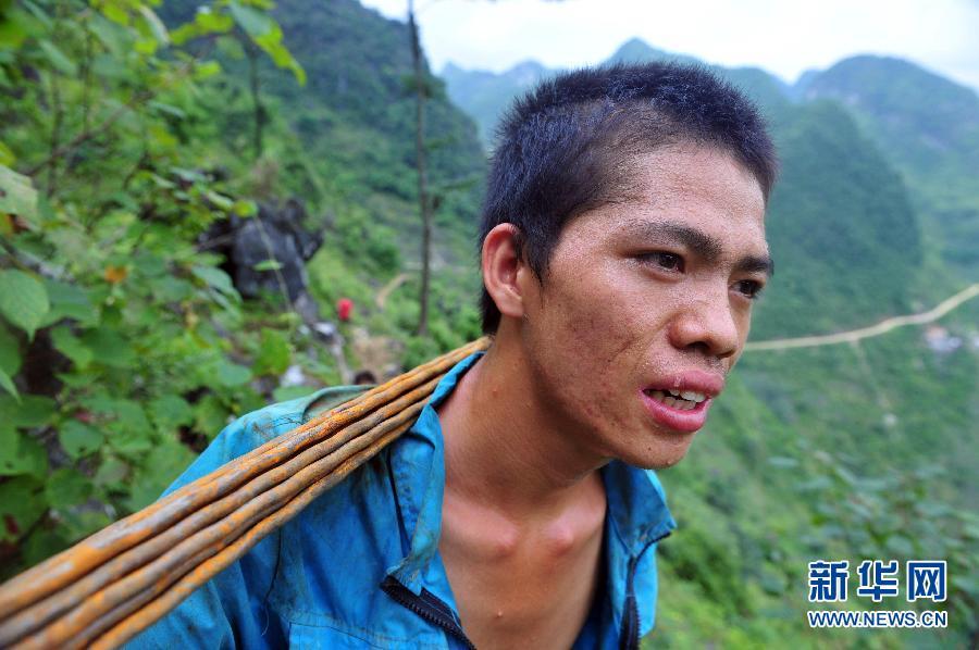 图为2014年6月18日,在大化瑶族自治县板升乡弄勇村弄为屯,一名村民背着钢筋走山路回家。弄为屯尚未通路,一些村民通过肩挑、马驮把建筑材料运进屯里修建房屋,另一些村民选择外迁到公路旁。新华社记者 黄孝邦 摄 图片来源:新华网