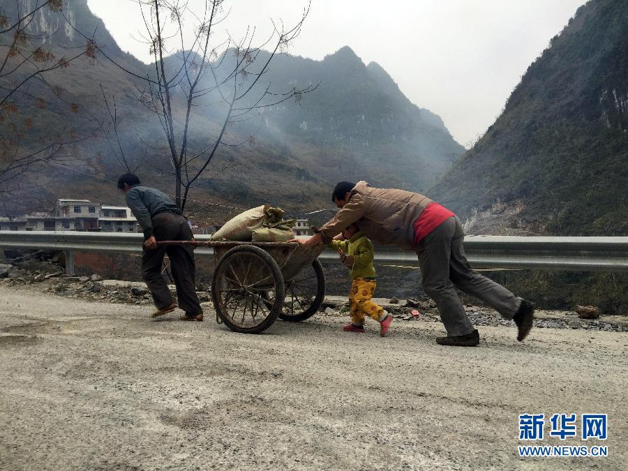 图为2月13日,在大化瑶族自治县板升乡弄立村,村民推着装水泥的小车回家修房子。新华社记者 黄孝邦 摄 图片来源:新华网