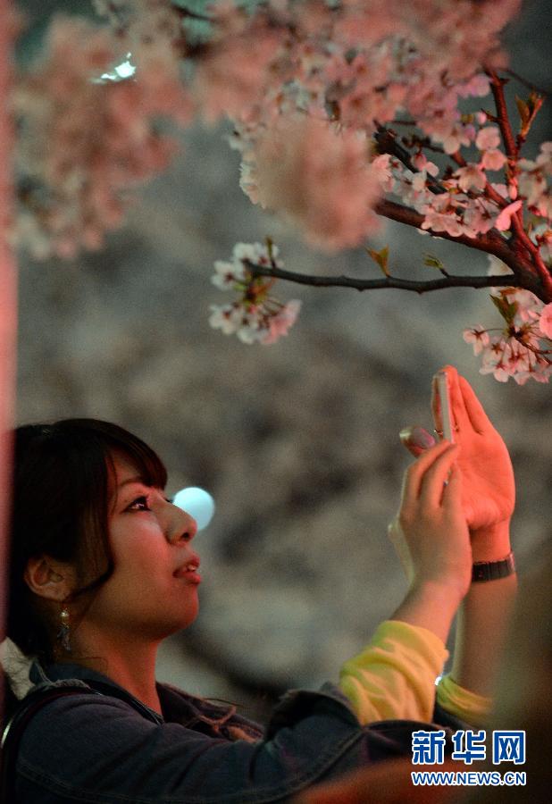 3月30日,在日本东京目黑川,一名参观者为夜樱拍照。时值樱花盛开季节,东京目黑川、千鸟渊等观赏夜樱的胜地吸引了大量赏花人群。 新华社记者马平摄