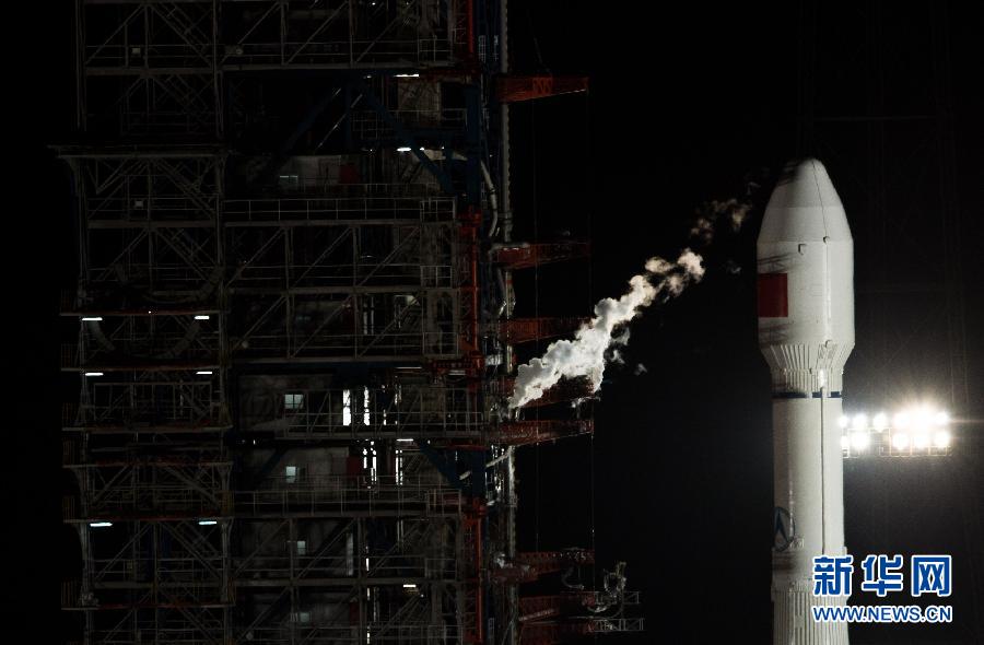3月30日,搭载首颗新一代北斗导航卫星的长征三号丙运载火箭在西昌卫星发射中心准备点火发射,远征一号上面级包裹在整流罩内。
