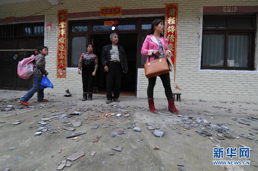 3月30日,新柳村一村民房屋因地震受损,一家人站在门口。当日,贵州省黔东南苗族侗族自治州剑河县发生5.5级地震。初步统计,地震已造成剑河县2200余户1.3万人受灾。目前,暂无灾区房屋倒塌、牲畜死亡等情况报告。记者第一时间进入位于震中的剑河县南加镇新柳村,直击地震灾区现场。新华社记者欧东衢摄